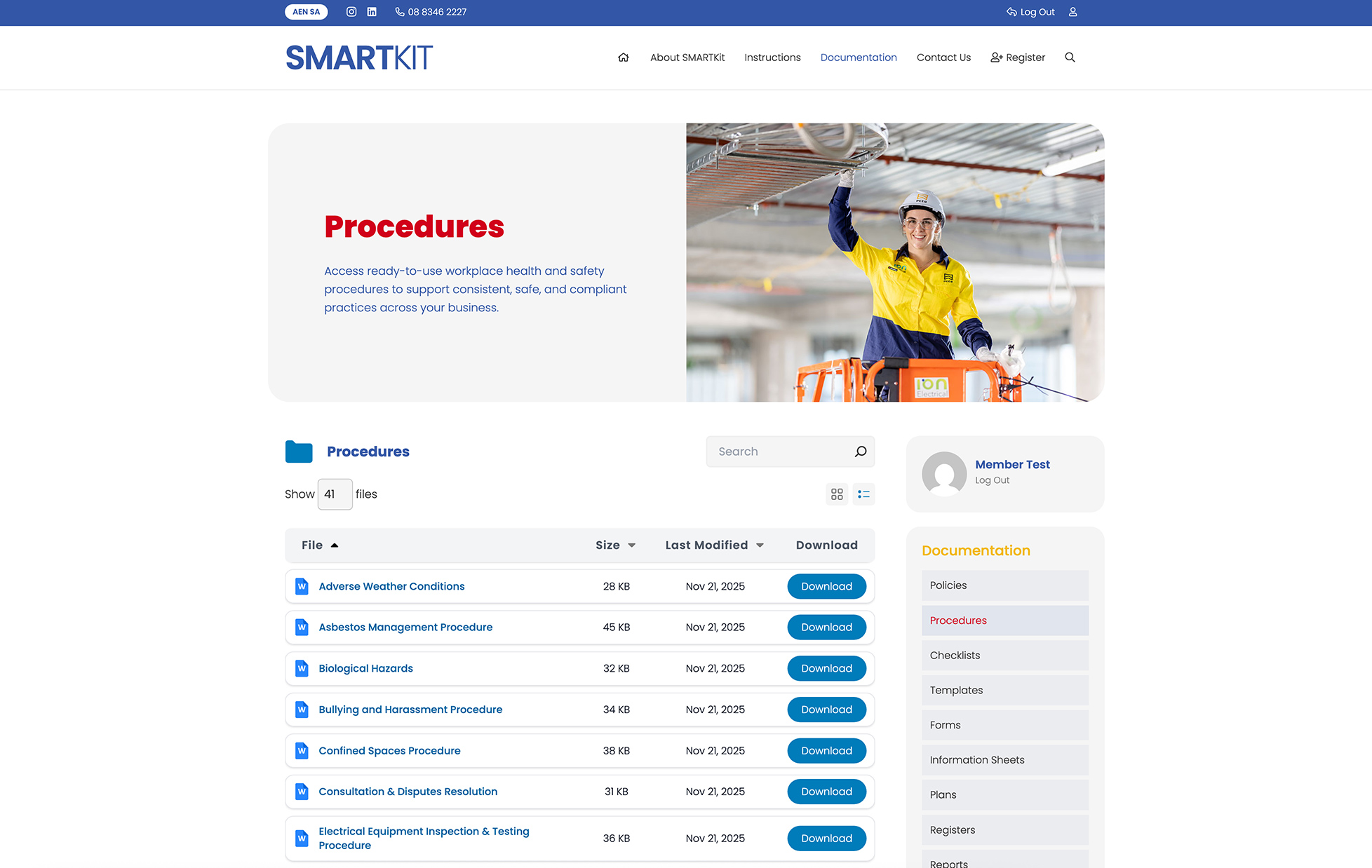 To download documents from the SMARTKit system, simply visit the relevant page (e.g. Procedures) and select the ‘Download’ button next to the document you require.